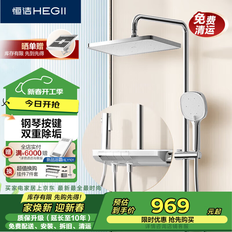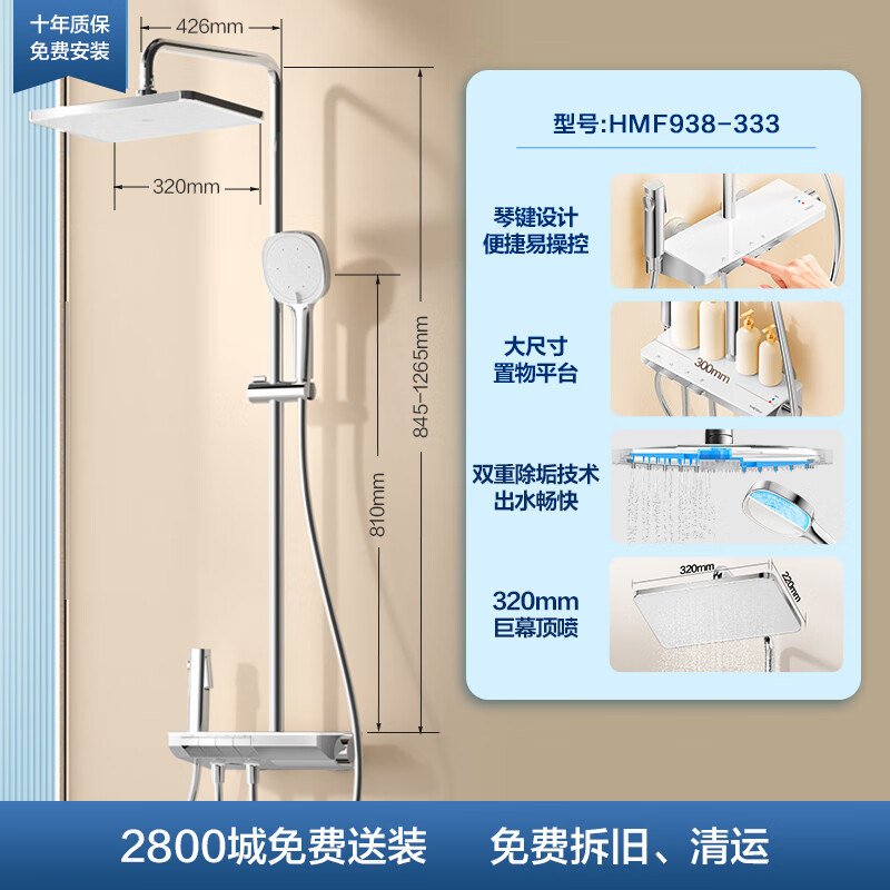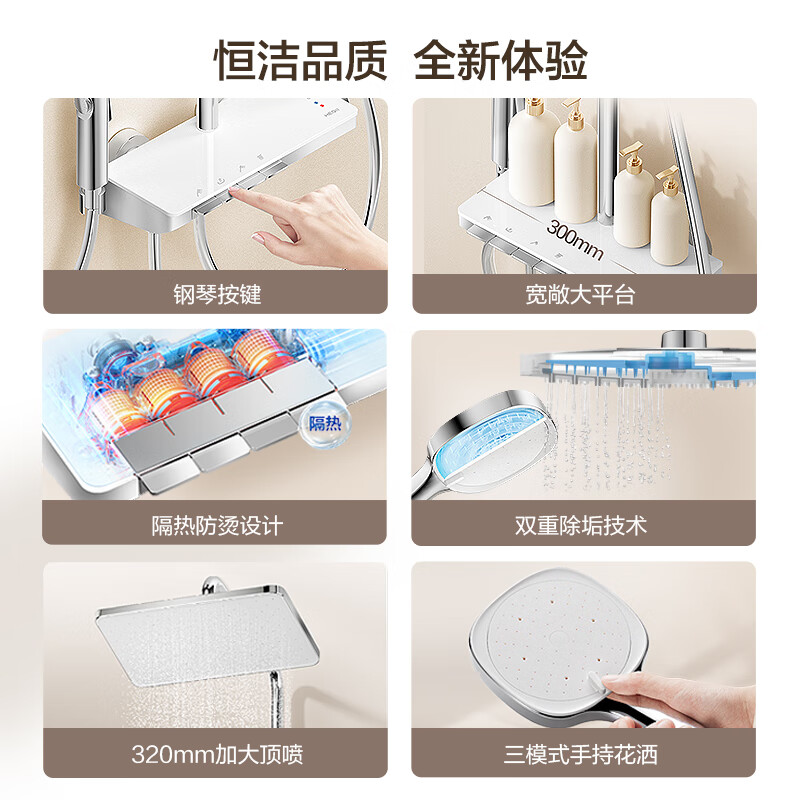 恒洁(HEGII)淋浴花洒套装Y55 按键大平台智能自动除垢花洒全套HMF938-333价格:1169.00元!