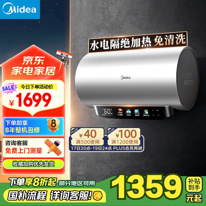 美的(Midea)水电分离60升电热水器家用 3300W变频10重过滤净肤瓷净舱除余氯内胆免清洗以旧换新F6033-PE9(HE)价格:1699.00元!