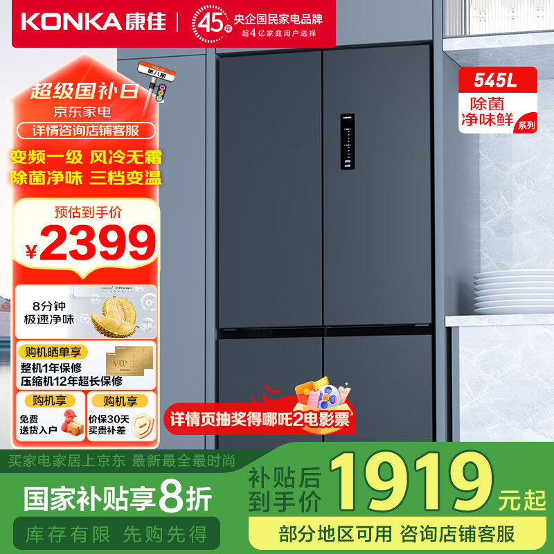 康佳8分钟净味冰箱545升双变频一级能效无霜双循环十字对开双开四开门BCD-545WEGQ4SP家电补贴价格:2399.00元!