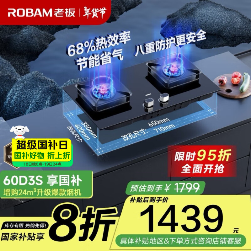 老板(Robam)JZT-57B6D家用燃气灶家电补贴20%天然气灶嵌入式燃气灶一级能效 5.2kW大火力猛火灶价格:1767.00元!
