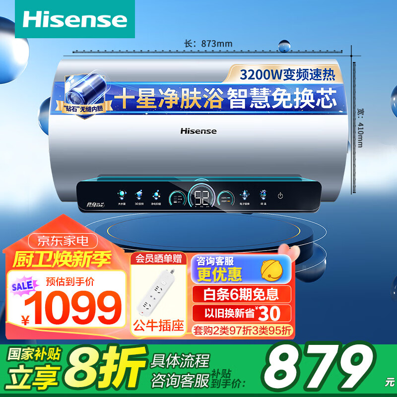 海信(Hisense)60升家用电热水器 3200W变频速热 一级能效 镁棒免更换 钻石无缝内胆 大屏C509i智享 补贴20%价格:1099.00元!