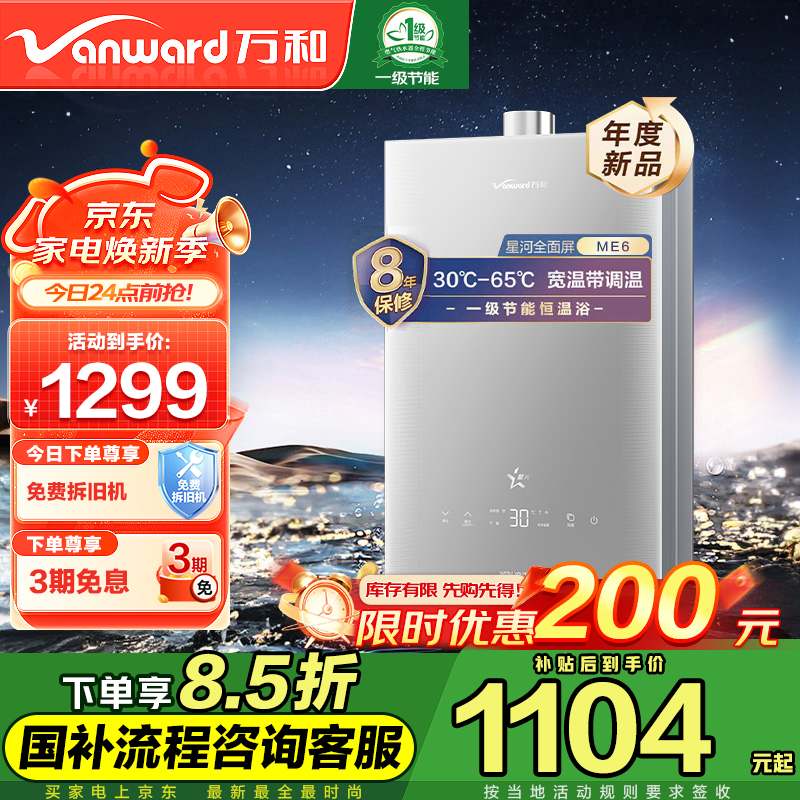 万和(Vanward)13升燃气热水器天然气【补贴15%】一级节能智控AI水气双伺服恒温 低水压启动JSQ25-ME6W13价格:1259.00元!
