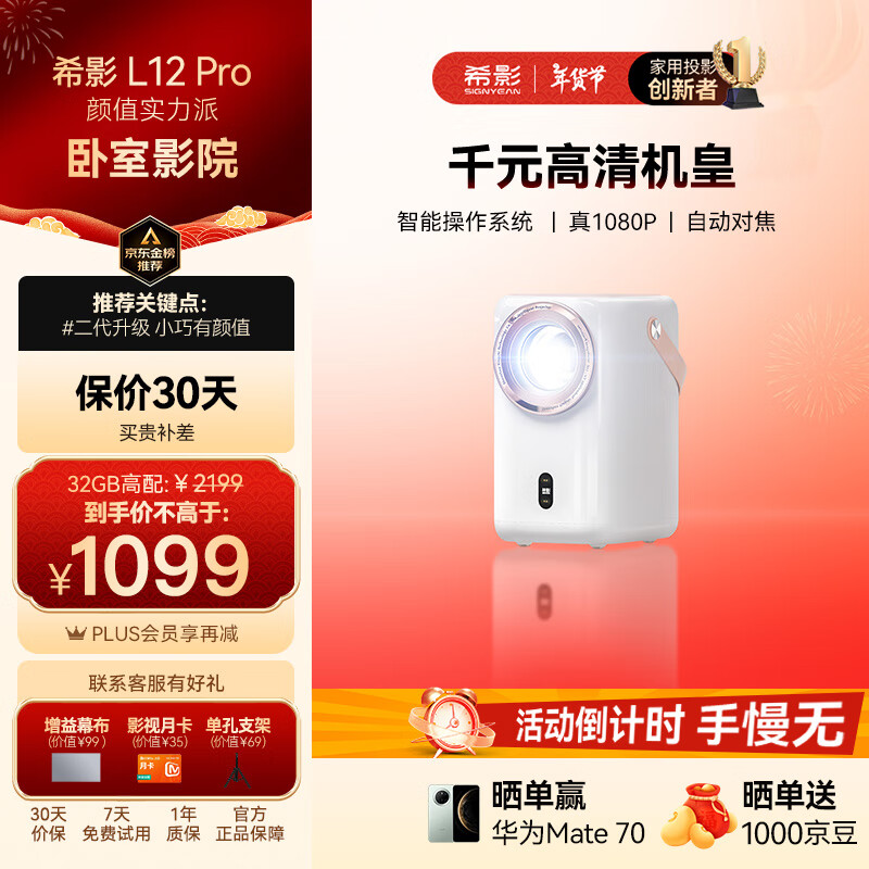 希影L12Pro二代家用投影仪智能家庭影院超高清家用卧室流明全自动对焦 1080P物理分辨率价格:1076.80元!