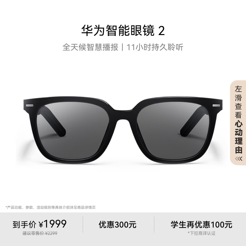 华为智能眼镜 2 方框太阳镜 无线双耳立体声/手势控制/长续航/开放式耳机价格:1999.00元!
