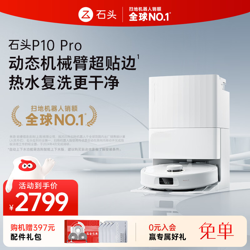 石头(roborock)扫地机器人扫拖一体 P10 Pro 扫拖洗烘一体机 自动集尘热水洗拖布烘干补水擦地拖地价格:2799.00元!