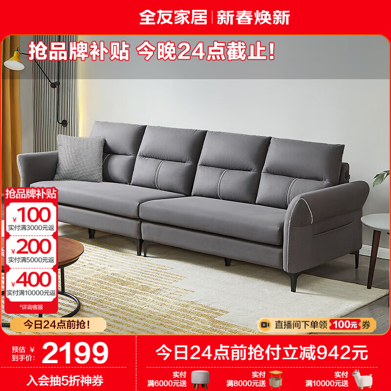 全友家居 现代简约功能科技布艺可拆洗储物小户型直排沙发客厅102679价格:3141.43元!