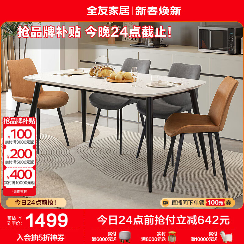 全友家居 餐桌耐用岩板台面长条桌餐厅稳固金属框架吃饭桌子DW1179价格:2141.43元!
