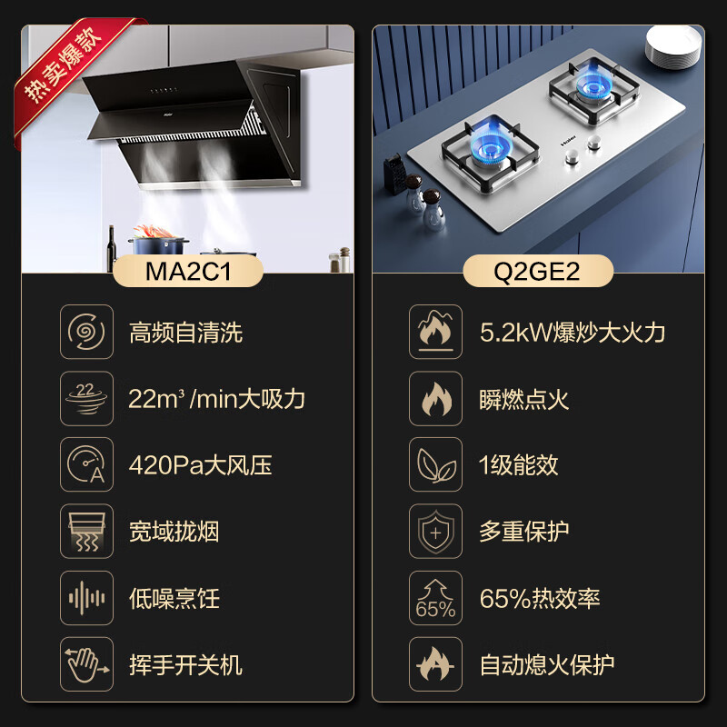 海尔(Haier)抽油烟机 侧吸式烟灶套着 22m3/min大吸力 5.2kw不锈钢灶具 油烟机燃气灶套装MA2C1价格:2099.00元!