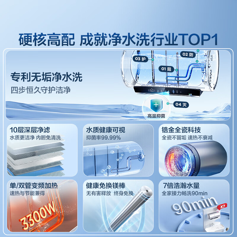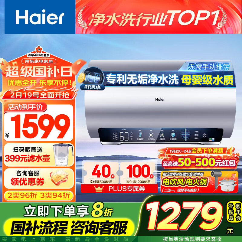 海尔(Haier)【小红花热水器-绽放版】60升补贴电热水器鲜活水净水洗家用储水式3.3kW变频速热EC6002-JH7U1价格:1599.00元!