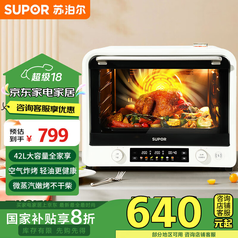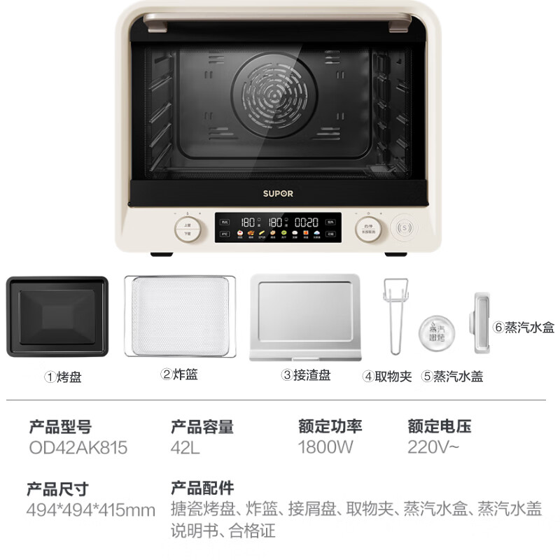 苏泊尔(SUPOR)家用风炉电烤箱 热风循环微蒸汽烤炸42L大容量独立控温低温发酵搪瓷内胆OD42AK815价格:799.00元!
