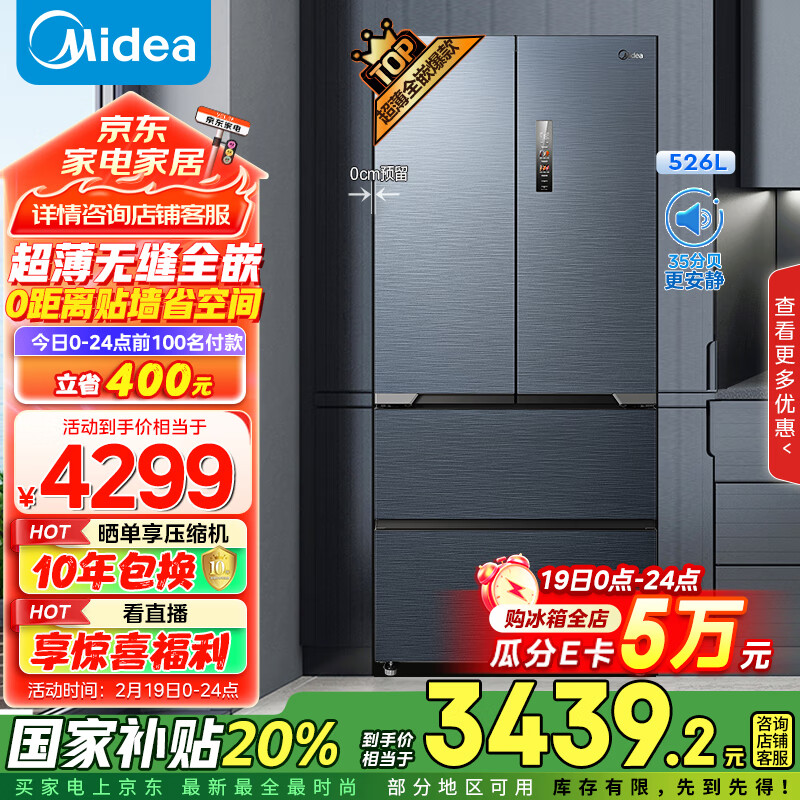 美的(Midea)无缝全嵌552法式多门超薄零嵌入大容量无霜一级能效风冷无霜变频家用冰箱以旧换新MR-552WUFPZE价格:4699.00元!