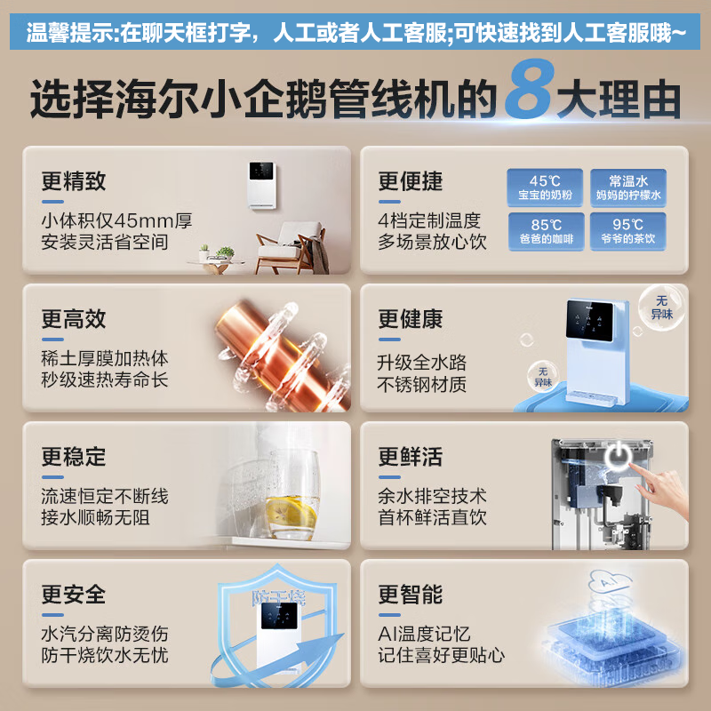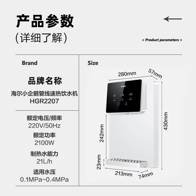 海尔(Haier)小企鹅管线机壁挂式饮水机家用无胆即热式厚膜速热 4档水温调节净水器伴侣净饮机HGR2207价格:1099.00元!