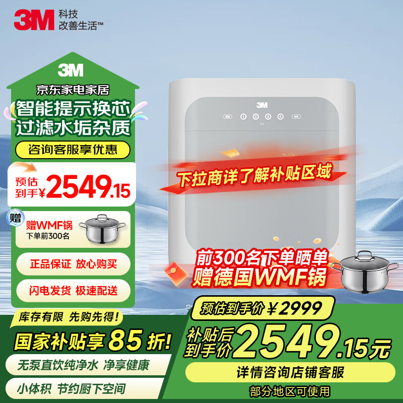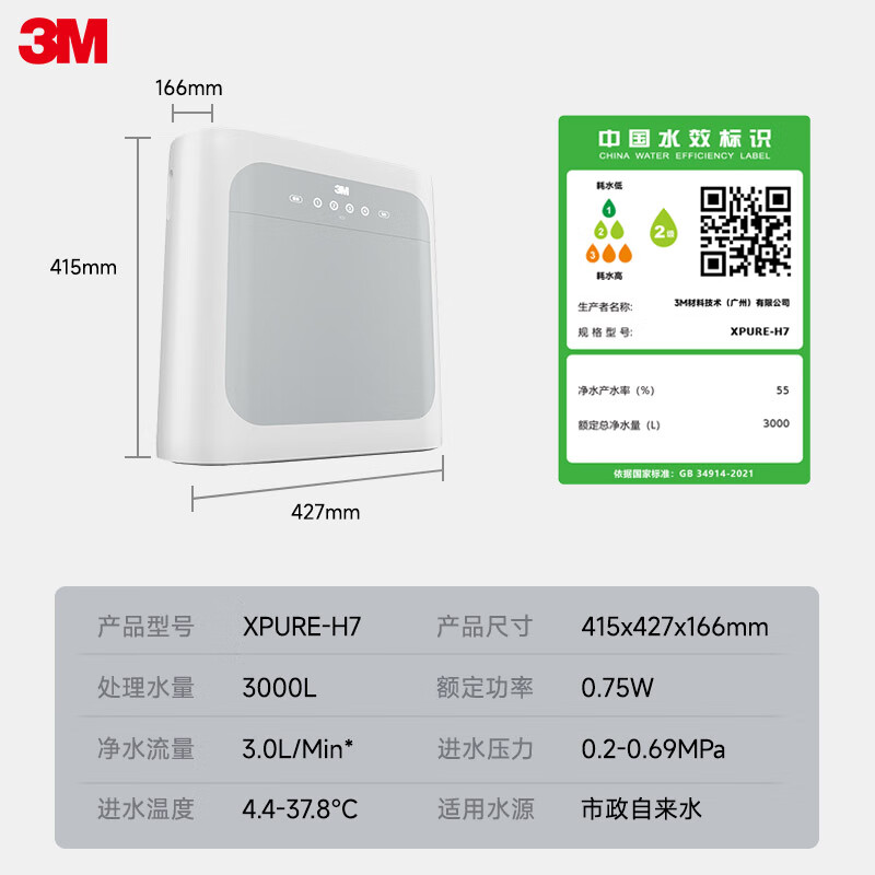 3M净水器家用净水机 无泵大流量纯水机过滤器净饮机小灰盒XPURE-H7 补贴价格:2999.00元!