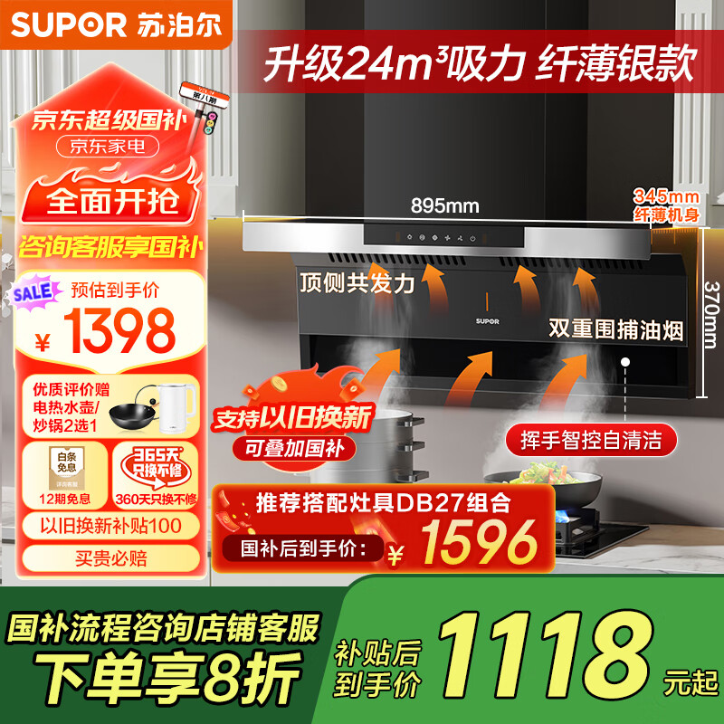 苏泊尔(SUPOR)[家电补贴至高20%]抽油烟机家用 24立方大吸力 顶侧双吸7字型挥手智控自清洁 单烟机DL11价格:1398.00元!