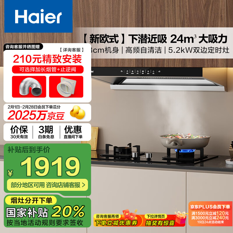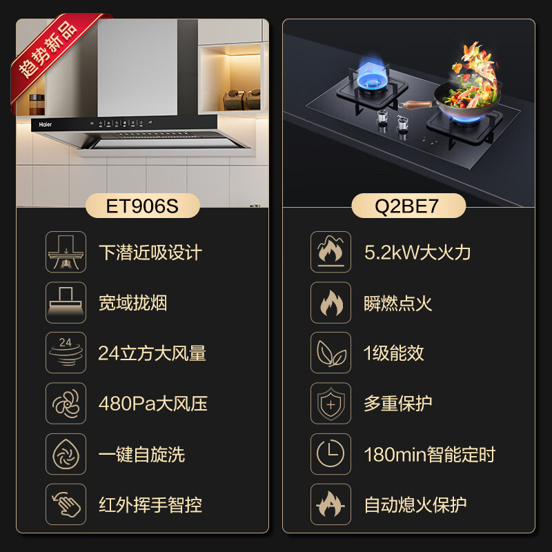 海尔(Haier)油烟机 抽油烟机燃气灶套装 新欧式深潜近吸24立方挥手感应 5.2kw双边定时烟灶套装ET906S+BE7天价格:2399.00元!