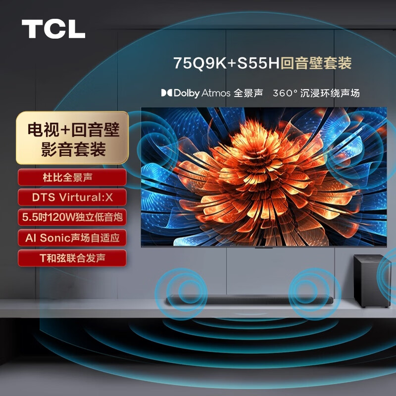 TCL音响版本-75Q9K 75英寸 QD-Mini LED电视 Q9K+杜比全景声回音壁 S55H价格:6698.00元!