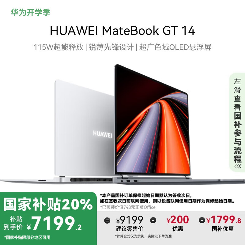 华为MateBook GT 14 酷睿Ultra 笔记本电脑 补贴20% 115W超能释放 Ultra 7 32G 1T 皓月银价格:8999.00元!