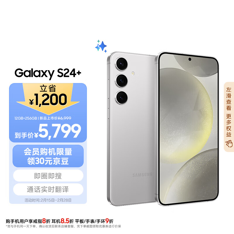 三星Samsung Galaxy S24+ AI手机 5000万像素 游戏手机 拍照手机 12GB+256GB 雅岩灰 政府补贴价格:5799.00元!