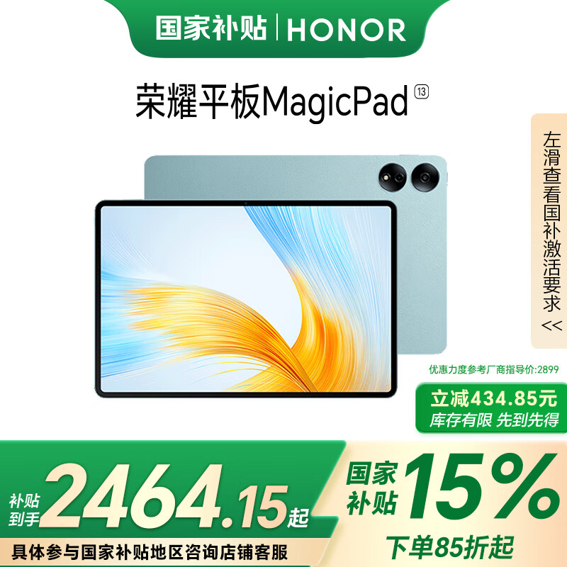 荣耀MagicPad 13英寸平板电脑【政府补贴15%平板】144Hz护眼屏 专业级8扬声器 补贴16+512GB天青色价格:2799.00元!