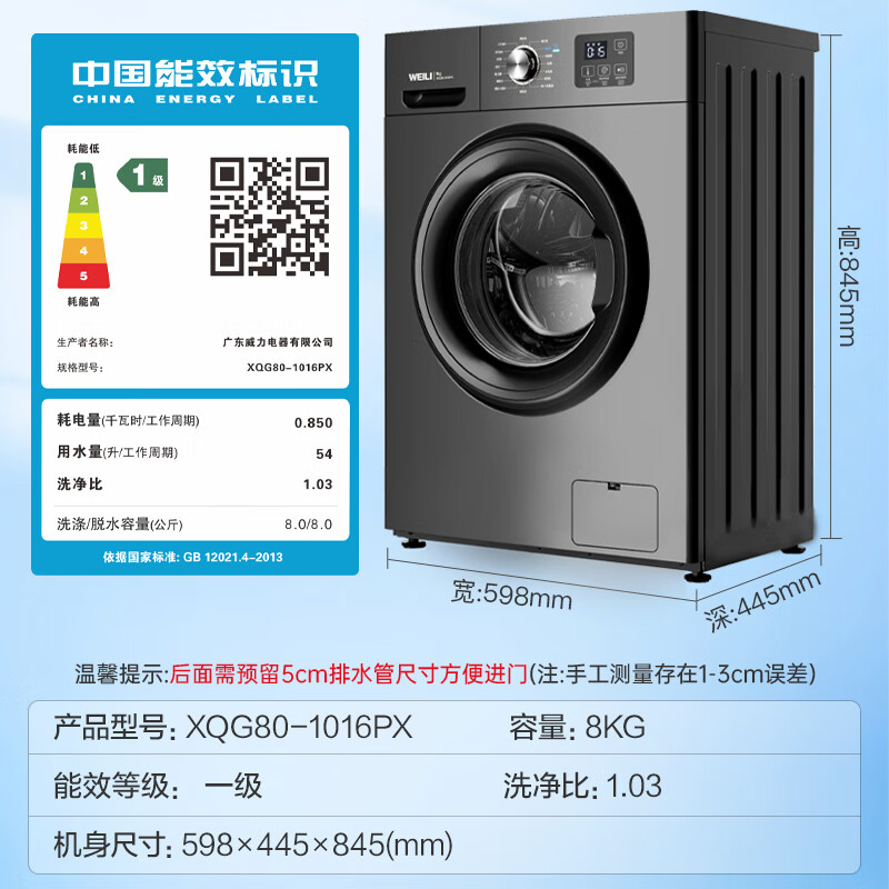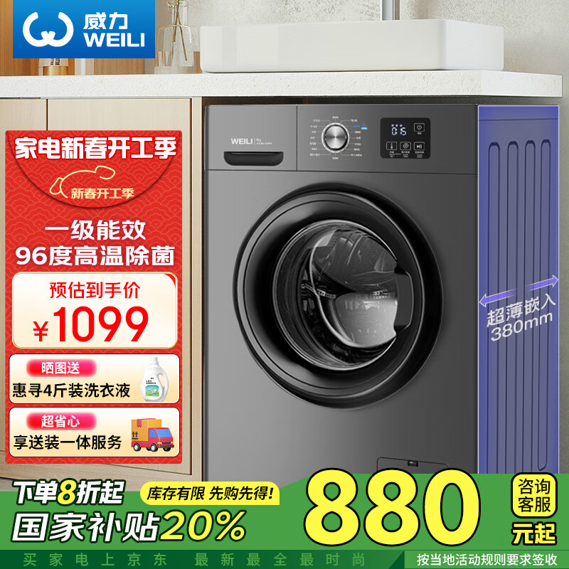 威力(WEILI)8公斤滚筒洗衣机全自动 超薄嵌入一级能效 99.99%除菌 LED显示屏 以旧换新XQG80-1016PX 送装一体价格:1099.00元!