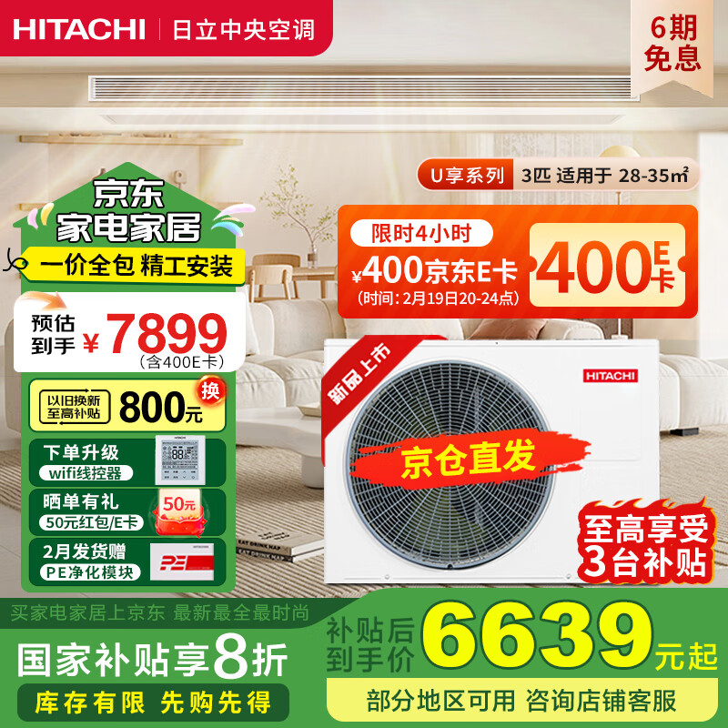 日立(HITACHI)中央空调风管机一拖一U享3匹家用嵌入式空调一价全包1级能效冷暖 家电补贴 RPIZ-72HDQ1/P价格:8799.00元!