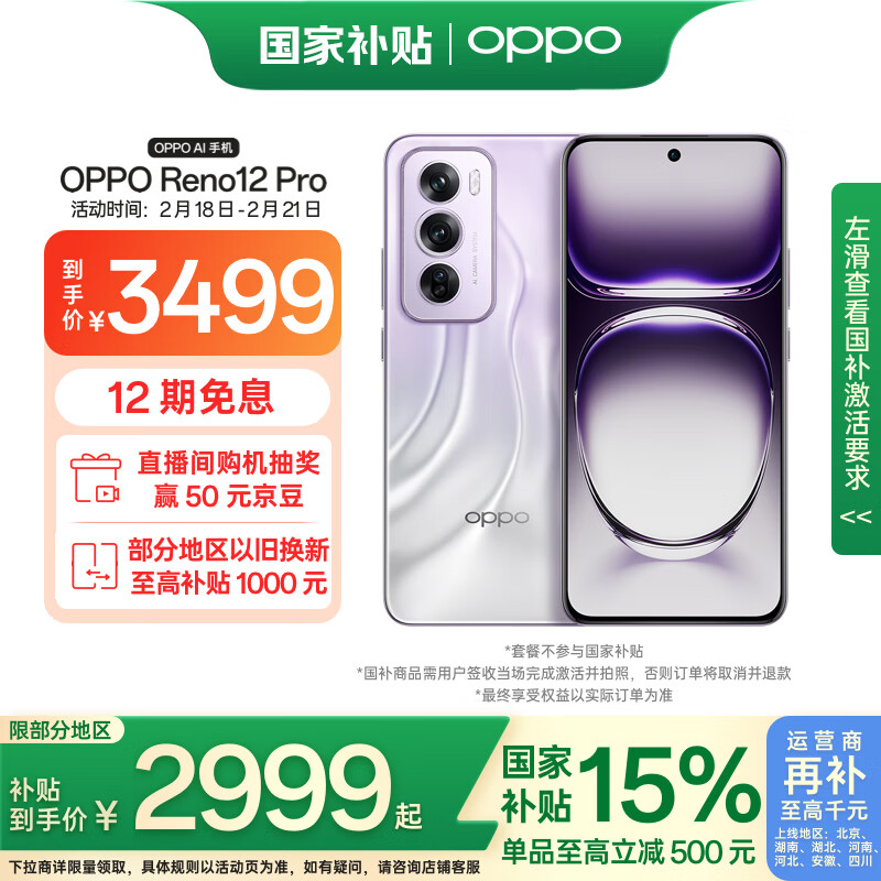 OPPO Reno12 Pro 16GB+256GB 银幻紫 超美小直屏 安卓Live图 政府补贴 智能游戏 AI拍照 学生5G手机价格:3499.00元!