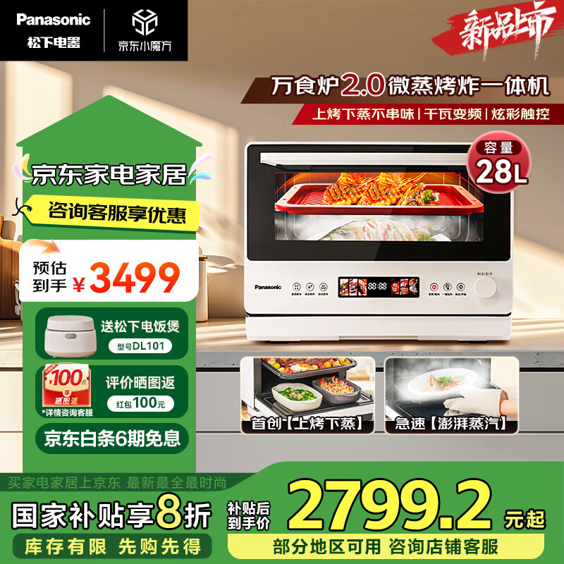 松下(Panasonic)【补贴】上烤下蒸万食炉2.0彩屏触控28L大容量家用变频微波炉微蒸烤炸一体机NN-DS285Q价格:3499.00元!
