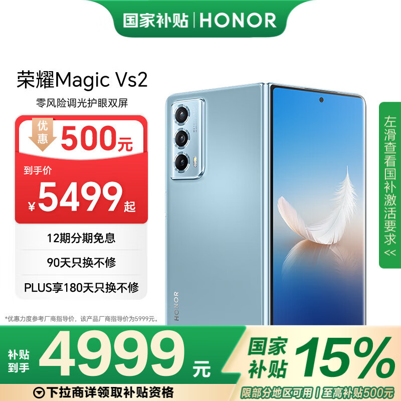 荣耀Magic Vs2 折叠屏 超轻薄设计 零风险调光护眼双屏 骁龙芯片 12+256 冰川蓝 5G AI手机 政府补贴价格:5229.00元!