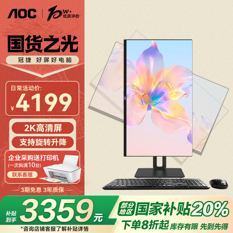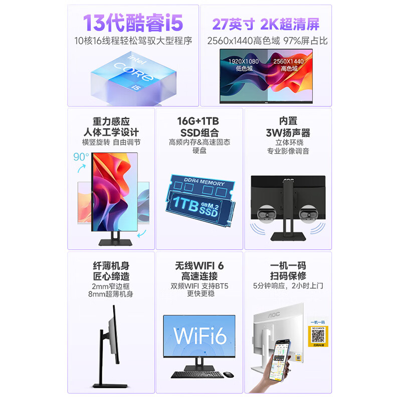 AOC补贴20%大师926PLUS27英寸2K商用办公一体机台式电脑(13代i5-13420H 16G 1T WIFI旋转升降)灰价格:4199.00元!