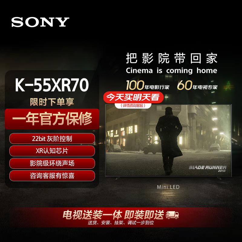 索尼(SONY)【包安装版(固定挂架送装一体)】55英寸 索尼电视7系 MiniLED 22bit灰阶控制 XR芯片 K-55XR70价格:10598.00元!