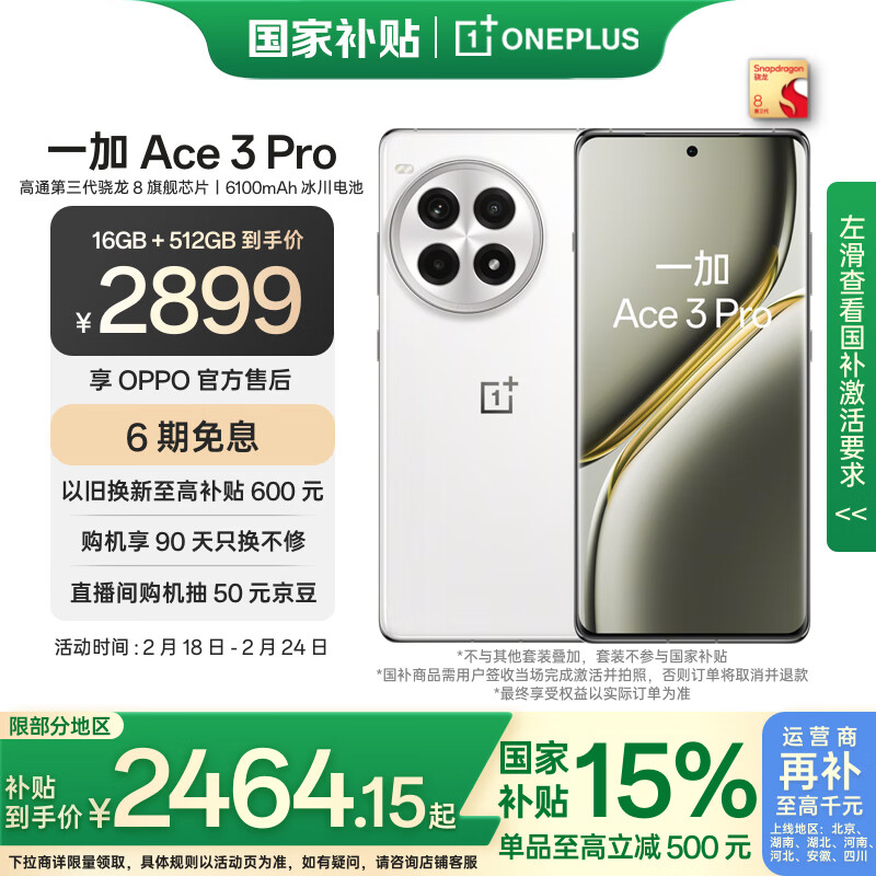 一加 Ace 3 Pro 16GB+512GB 超跑瓷典藏版 政府补贴 第三代骁龙 8 旗舰芯片 oppo智能游戏5G手机价格:3699.00元!