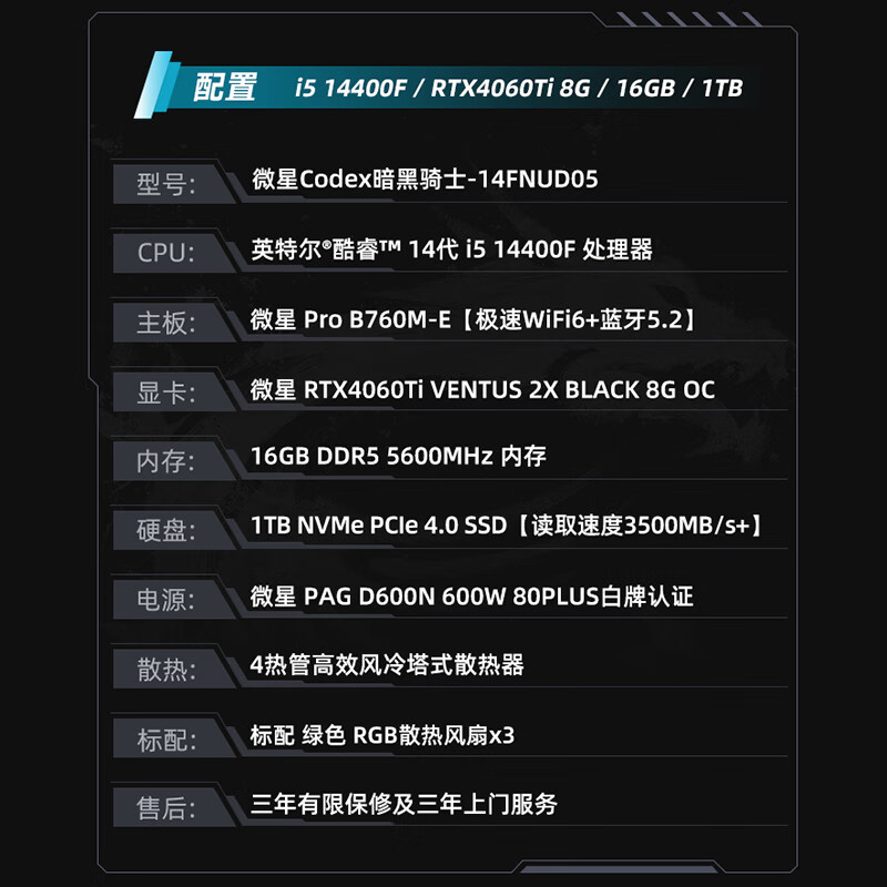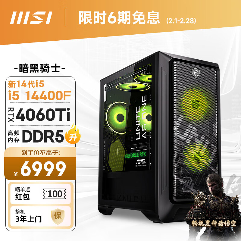 微星(MSI)暗黑骑士MAG 14代i5 14400F/RTX4060Ti/16G/1T 电竞游戏设计师台式电脑主机整机价格:7399.00元!