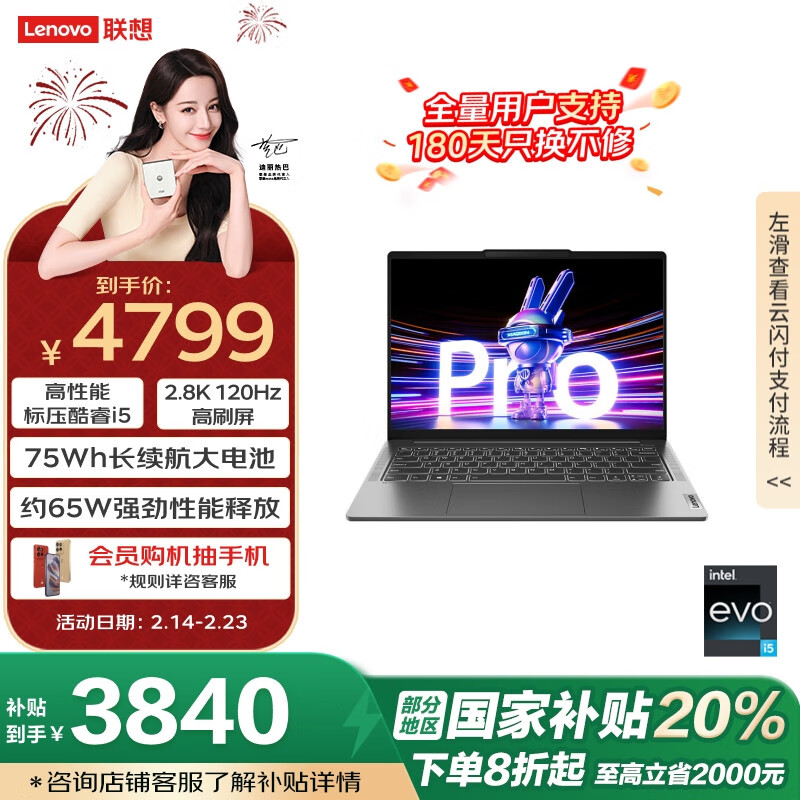 联想【补贴20%笔记本电脑】小新Pro14超能本 高性能轻薄本标压酷睿i5 16G 1T 2.8K高刷屏 游戏办公价格:4799.00元!