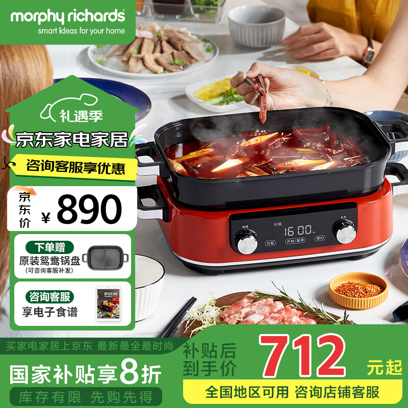摩飞电器(Morphyrichards)多功能锅 家用电火锅电蒸锅 5升可预约 大功率分体式蒸煮一体不沾煎烤料理锅 MR9099 英石红价格:890.00元!
