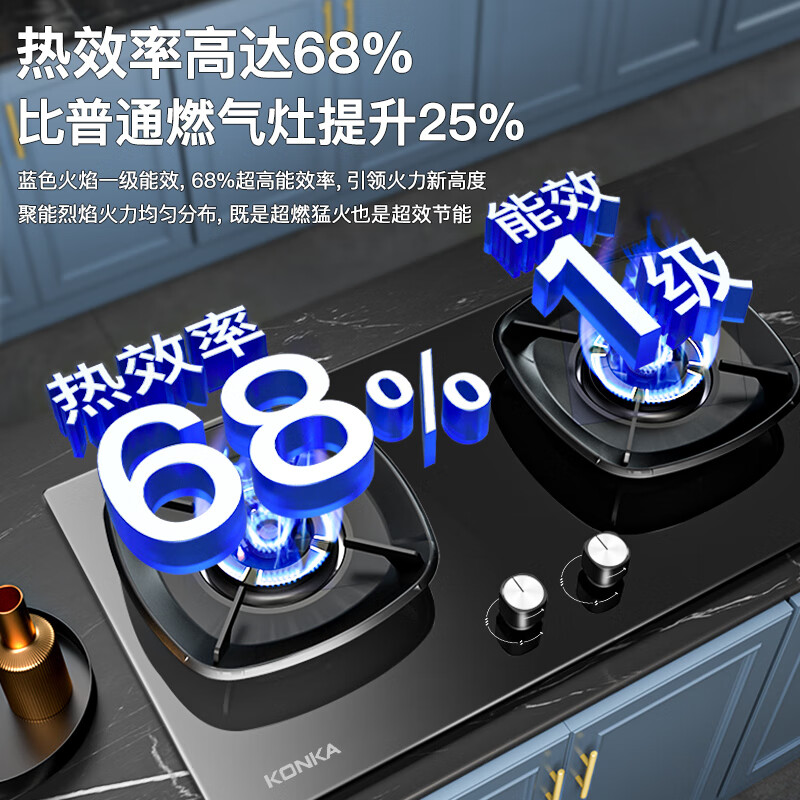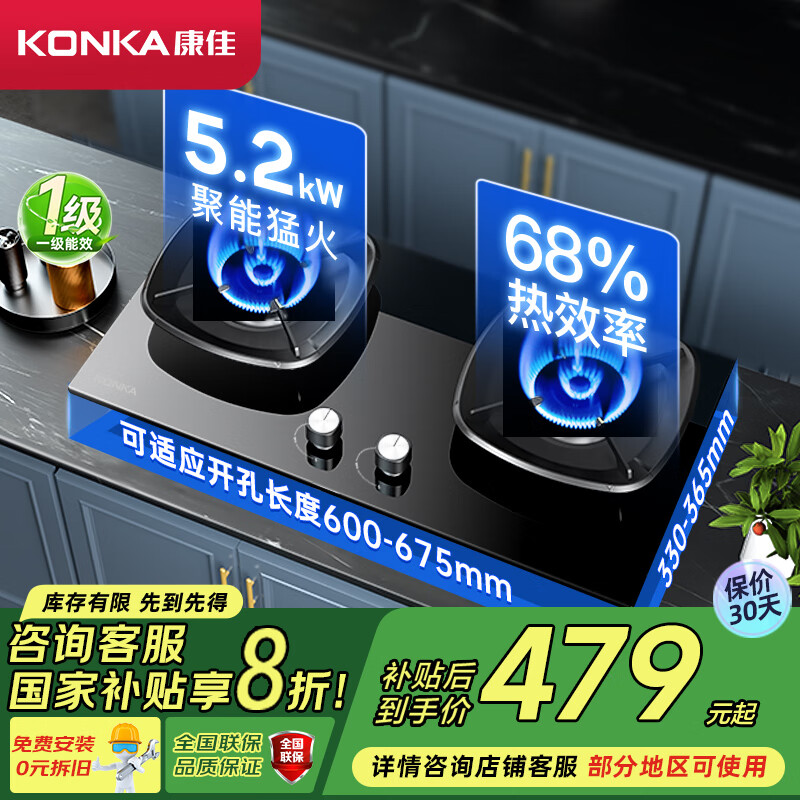 康佳(KONKA)燃气灶煤气灶双灶具 5.2kW液化气68%高热效率家用节能灶 聚能防风补贴 JZY-B520YG(液化气)价格:598.06元!