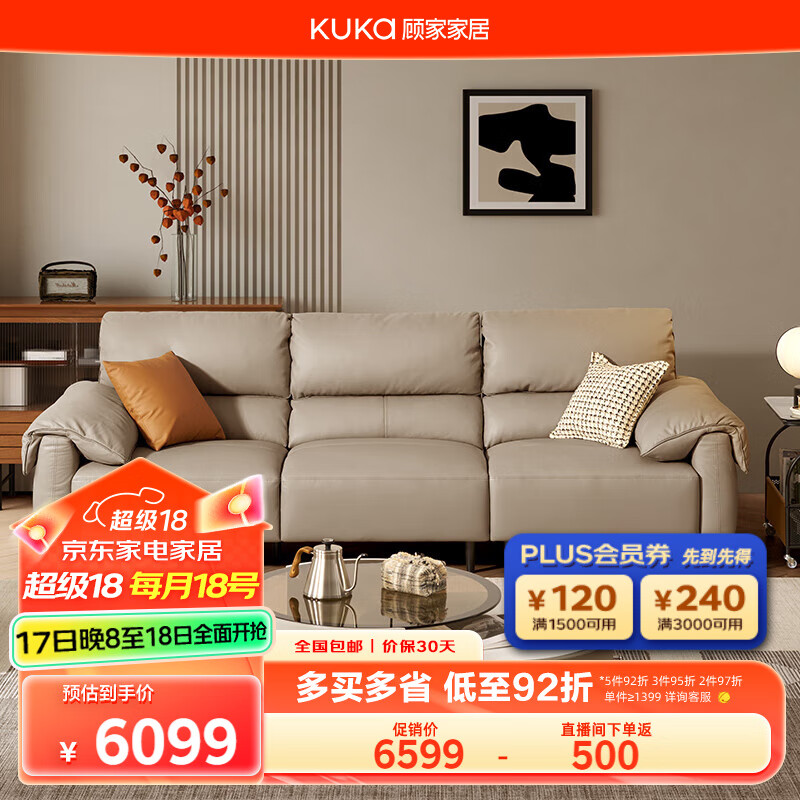 顾家家居(KUKA)【云端系列】现代头层牛皮沙发客厅垂耳扶手1253【燕麦色】三人位价格:6599.00元!