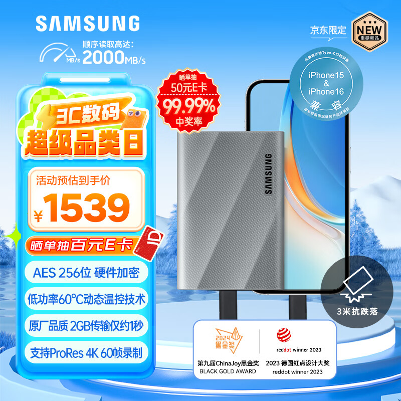 三星(SAMSUNG)2TB Type-c USB 3.2 移动固态硬盘 T9星际灰|京东限定 NVMe读速2000MB/s 手机直连笔记本外接价格:1539.00元!