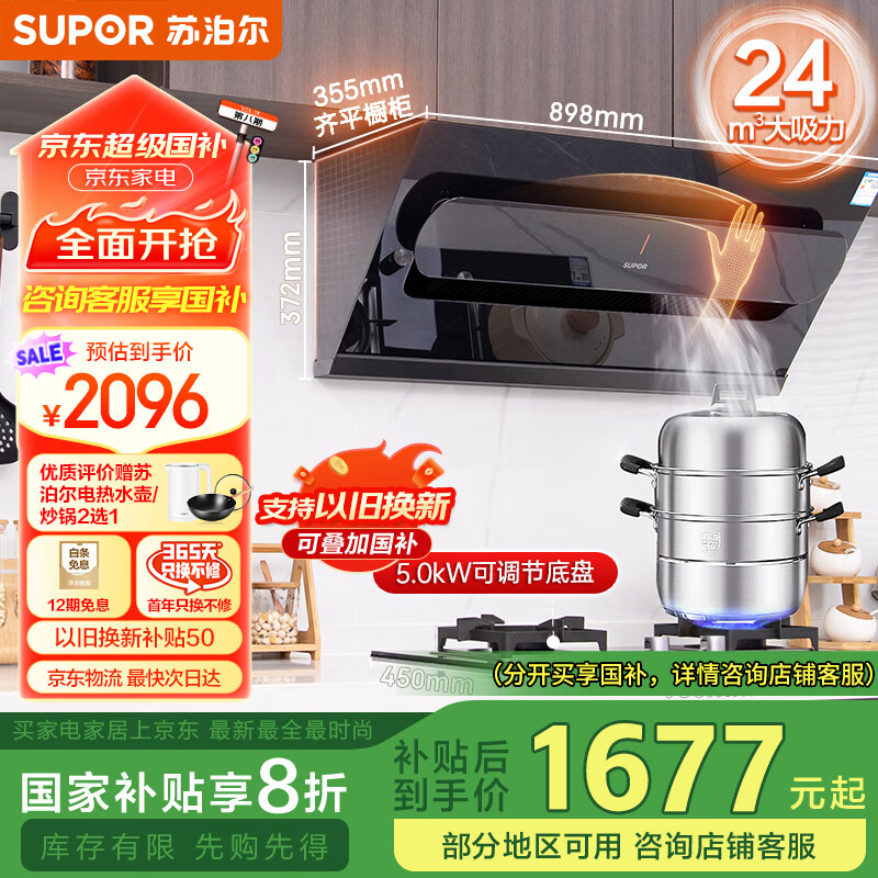 苏泊尔(SUPOR)抽油烟机家用 24立方变频900Pa风压 侧吸式355mm纤薄机身速拢智吸 燃气灶套装DJ50S+DB28液化气价格:2096.00元!
