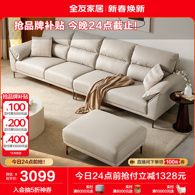 全友家居 现代简约科技布沙发客厅大象耳朵豆腐块直排沙发家具111077价格:4427.14元!