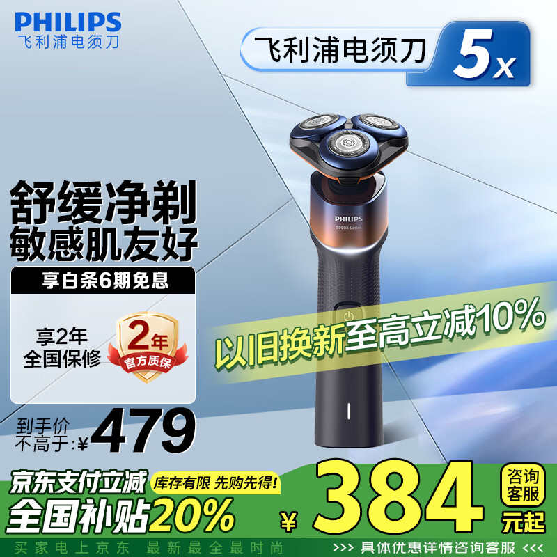 飞利浦(PHILIPS)电动剃须刀5X活力橙 SkinEase智能舒缓刮胡刀 生日礼物送男友送老公 补贴价格:479.00元!