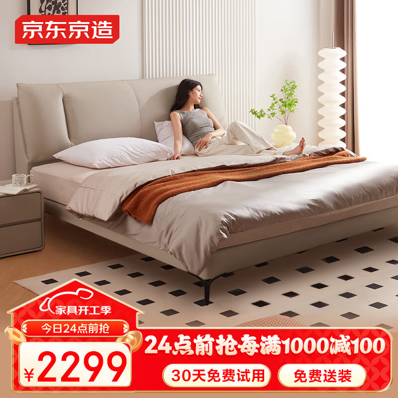 京东京造家居大黑牛真皮床 荷兰头层牛皮实木排骨架主卧双人床1.8×2米 白价格:2499.00元!