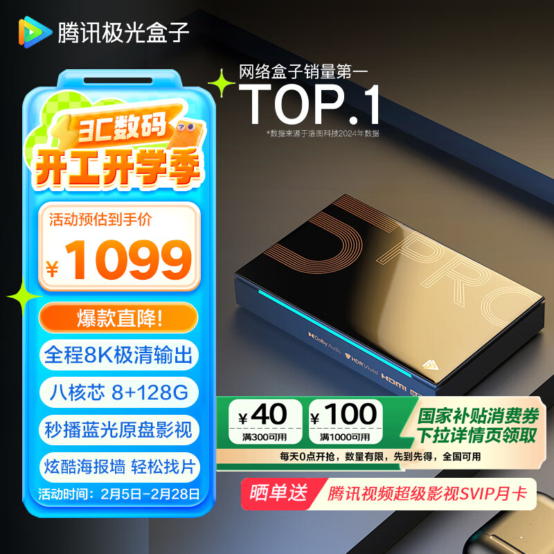 腾讯极光盒子5Pro 全程8K超高清电视盒子 八核智能网络机顶盒 杜比蓝光云盘硬盘播放机 无损音乐播放器价格:1199.00元!