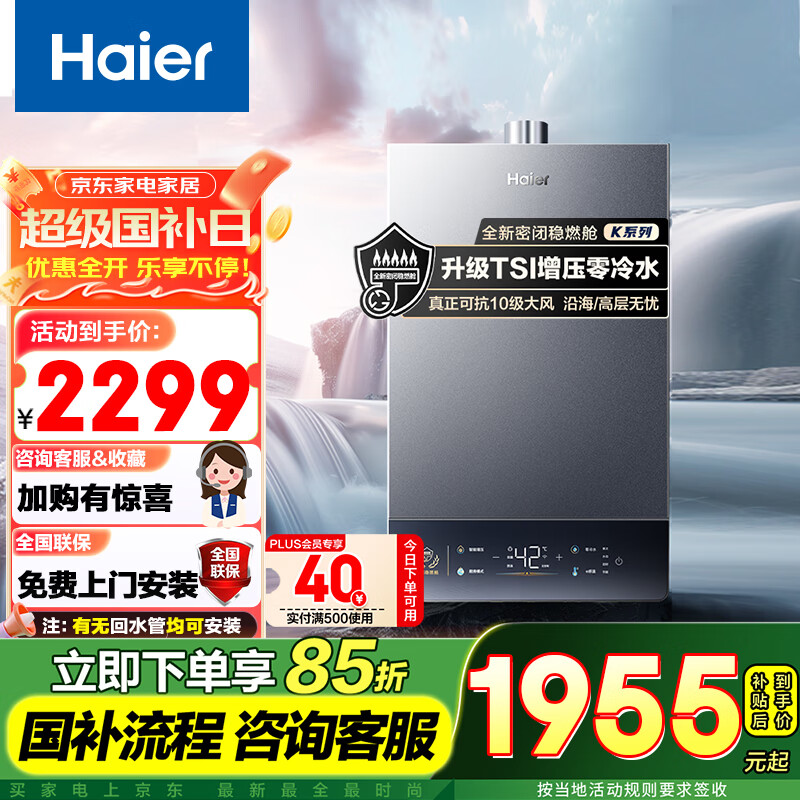 海尔(Haier)16升【K系列KT5】零冷水燃气热水器天然气水伺服恒温 TSI增压 静音JSQ31-16KT5FPRCU1【以旧换新】价格:2299.00元!