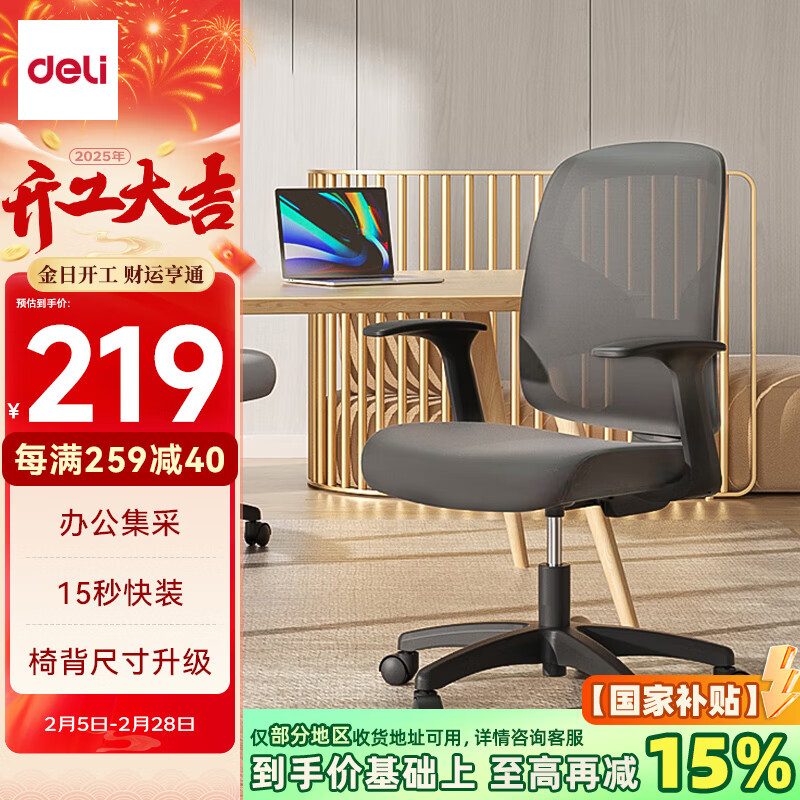 得力(deli)4900S 人体工学靠背办公椅/电脑椅/职员椅 可升降转椅舒棉坐垫 灰价格:259.00元!