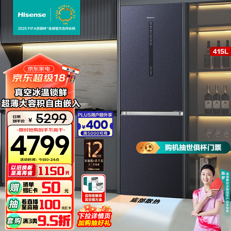 海信(Hisense)415真空魔方冰箱超薄嵌入式冰箱双开门二门一级能效家电补贴20%以旧换新BCD-415WTDGVBPIV价格:5299.00元!