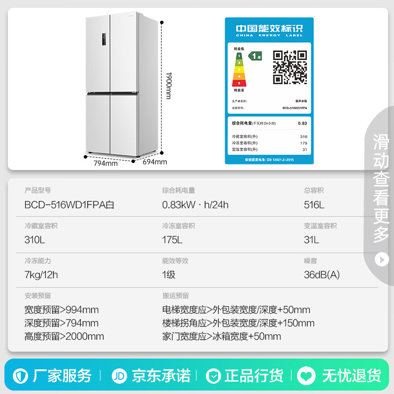 4、外形外观:非常好看!制冷效果:非常棒!保鲜效果:IDP主动净味,无异味!容量大小:516L大容量!以旧换新:以旧换新性价比超高!