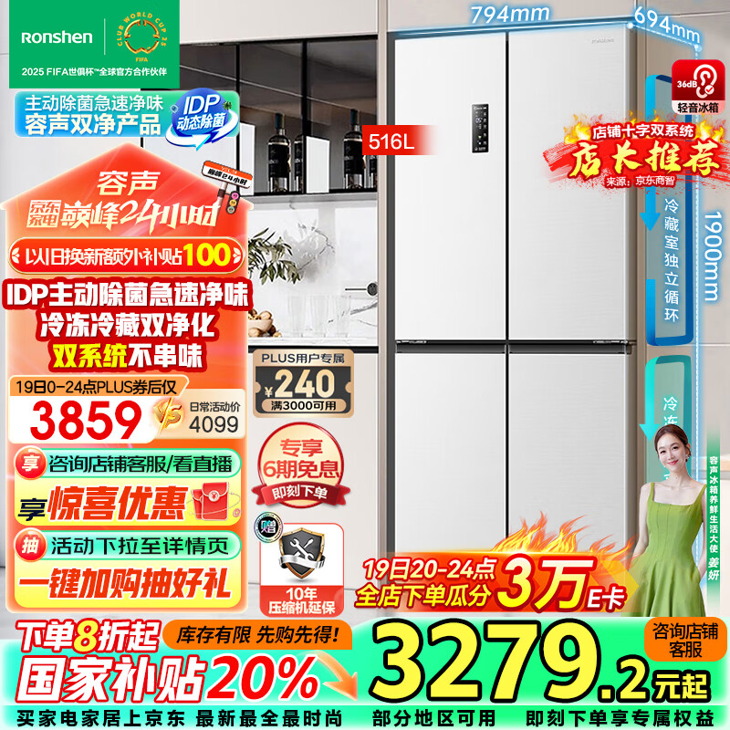 容声(Ronshen)516升双净双系统十字对开四开门电冰箱家用一级能效风冷无霜BCD-516WD1FPA白526十字款补贴20%价格:4599.00元!