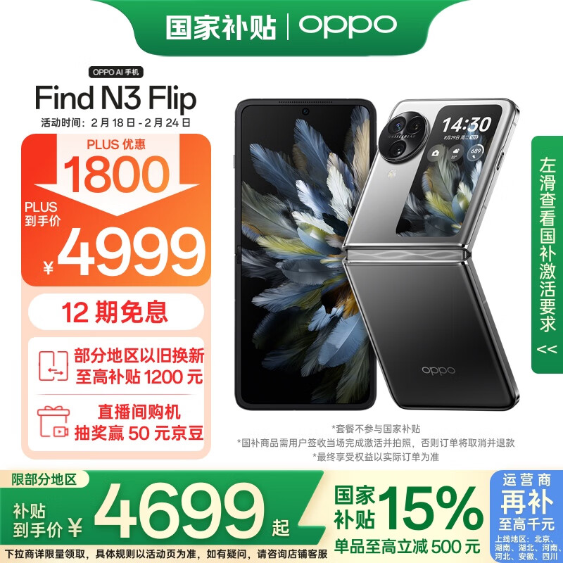OPPO Find N3 Flip 12GB+256GB 镜中之夜 超光影三摄 专业哈苏人像 政府补贴 5G 拍照 AI 小折叠屏手机价格:5199.00元!