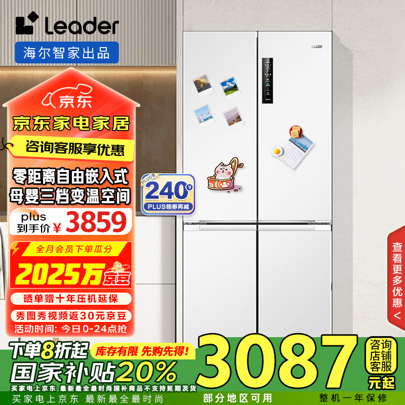 统帅(Leader)海尔智家出品补贴20%502L一级风冷白色四开十字对开门T型零嵌入式电冰箱BCD-502WGLTD49W9U1价格:4599.00元!