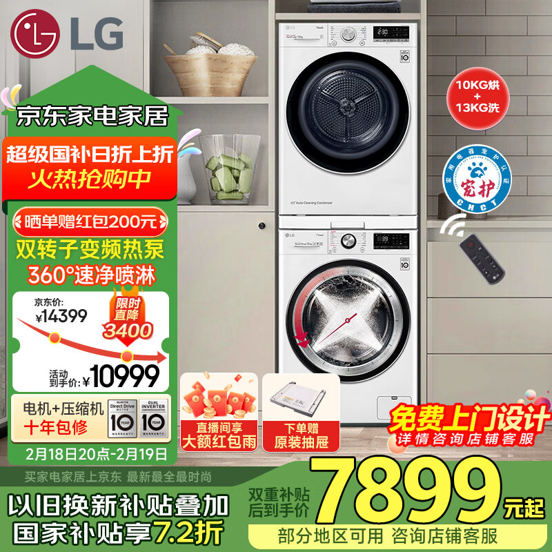 LG 容慧大容量洗烘套装13kg洗衣机+10kg原装进口变频热泵遥控FCV13G4W+RH10V9AV4W补贴以旧换新价格:10999.00元!
